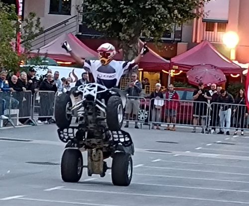 Le soir venu, Kymco a organisé diverses activités. Dans premier temps les quadeurs ont eu le droit à un show du célèbre Italien Roberto Poggialo qui a effectué plusieurs acrobaties sur la grande place de Mende qui a su attisé la curiosité des locaux, un pari réussi pour Kymco qui a réuni du beau monde dans une ambiance très chaleureuse.